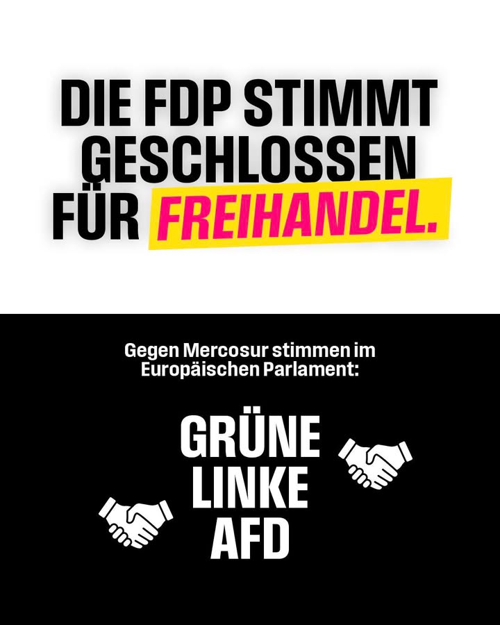 Christian Dürr: „Dass AfD, Linke und Grüne Hand in Hand unsere Wirtschaft sabotieren und uns in der jetzigen Lage schaden, zeigt: Wir brauchen eine wirtschaftspolitische Brandmauer gegenüber all jenen, die uns in den Ruin treiben. Millionen fleißiger Menschen stehen täglich auf, um ihr Bestes zu geben – und links-rechts-grün zerstört mutwillig Chancen, Wachstum und Arbeitsplätze. All diese Parteien sind in diesen Zeiten unwählbar und verraten die Interessen unseres Landes.“ #Mercosur
